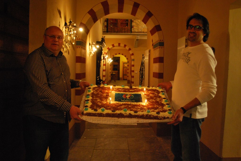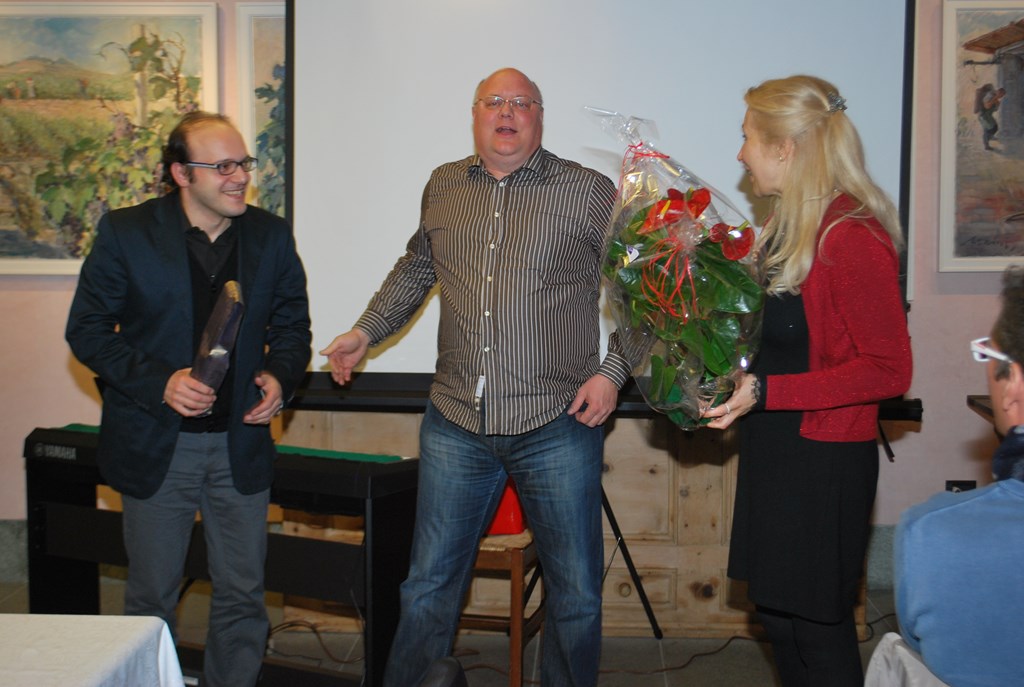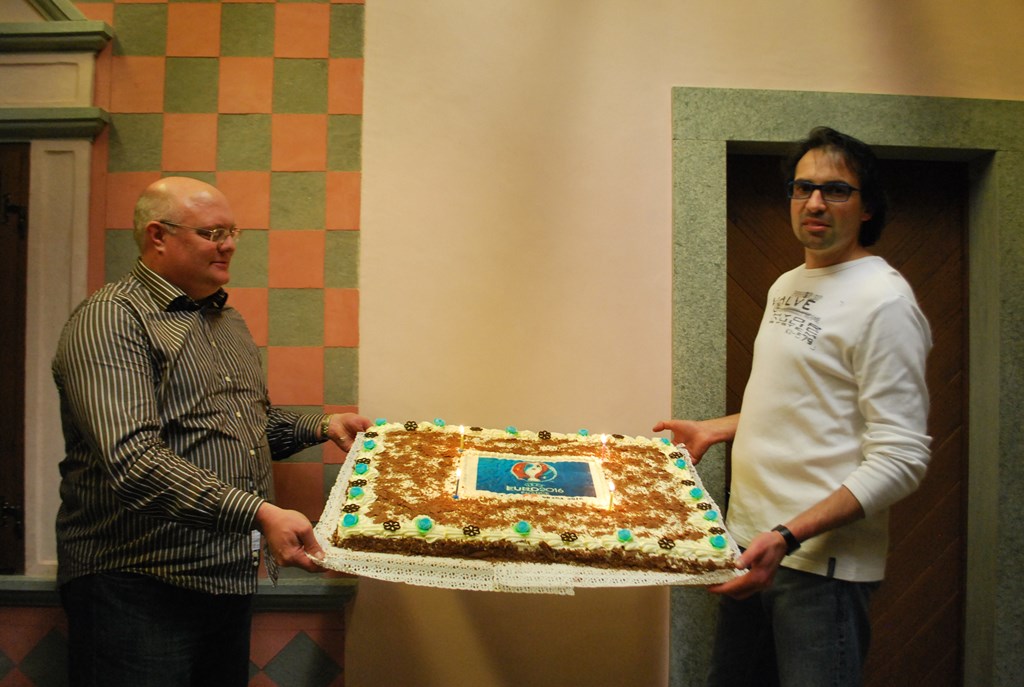 Sergio "Guru" Gurini e Marcandrea Paganini mostrano agli invitati la torta realizzata da Ivan Rossi.
